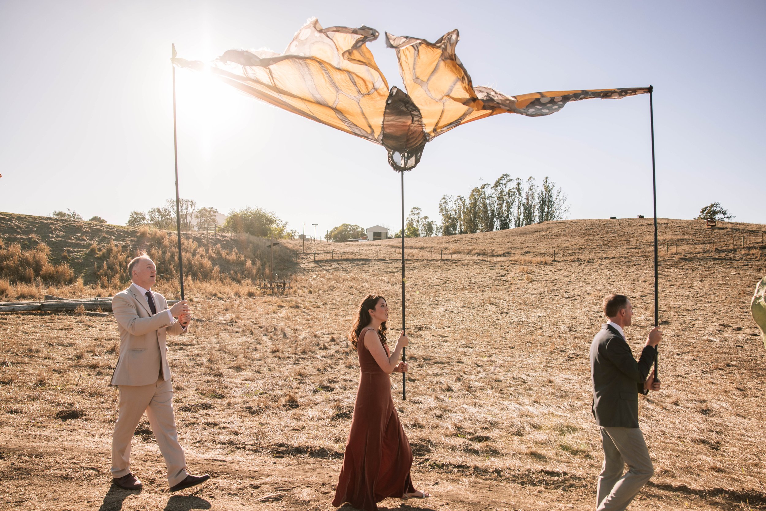 Each butterfly has a wingspan of approximately 9 feet. They are animated using bamboo poles or telescoping fiberglass poles and are typically puppeteered by two or three performers working together. This allows for nuanced, floating, gliding, and gently beating wing movements.