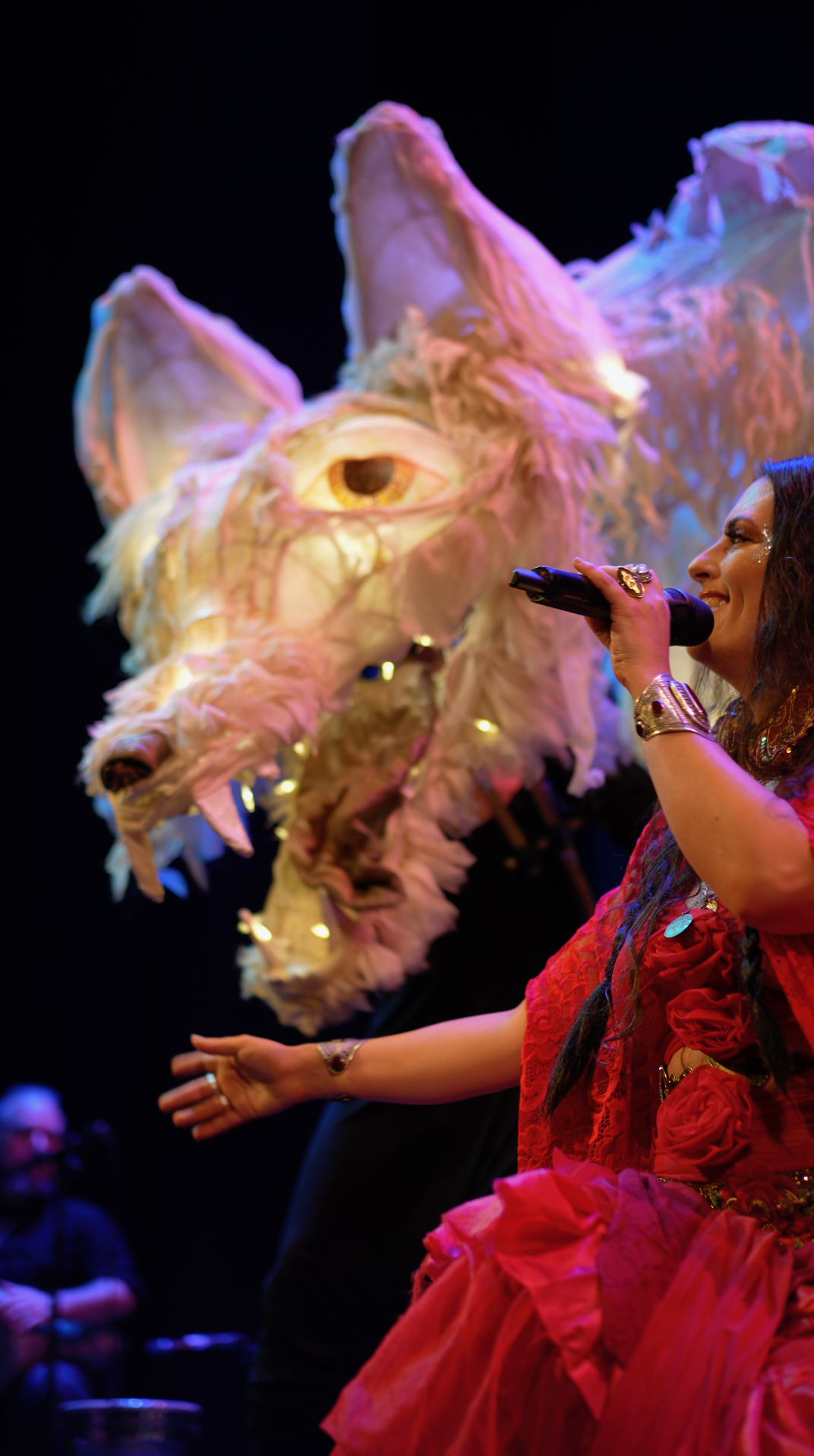 The puppet’s scale and articulated movement give it a powerful, animal-like presence, allowing it to move through space in a way that feels both majestic and alert.